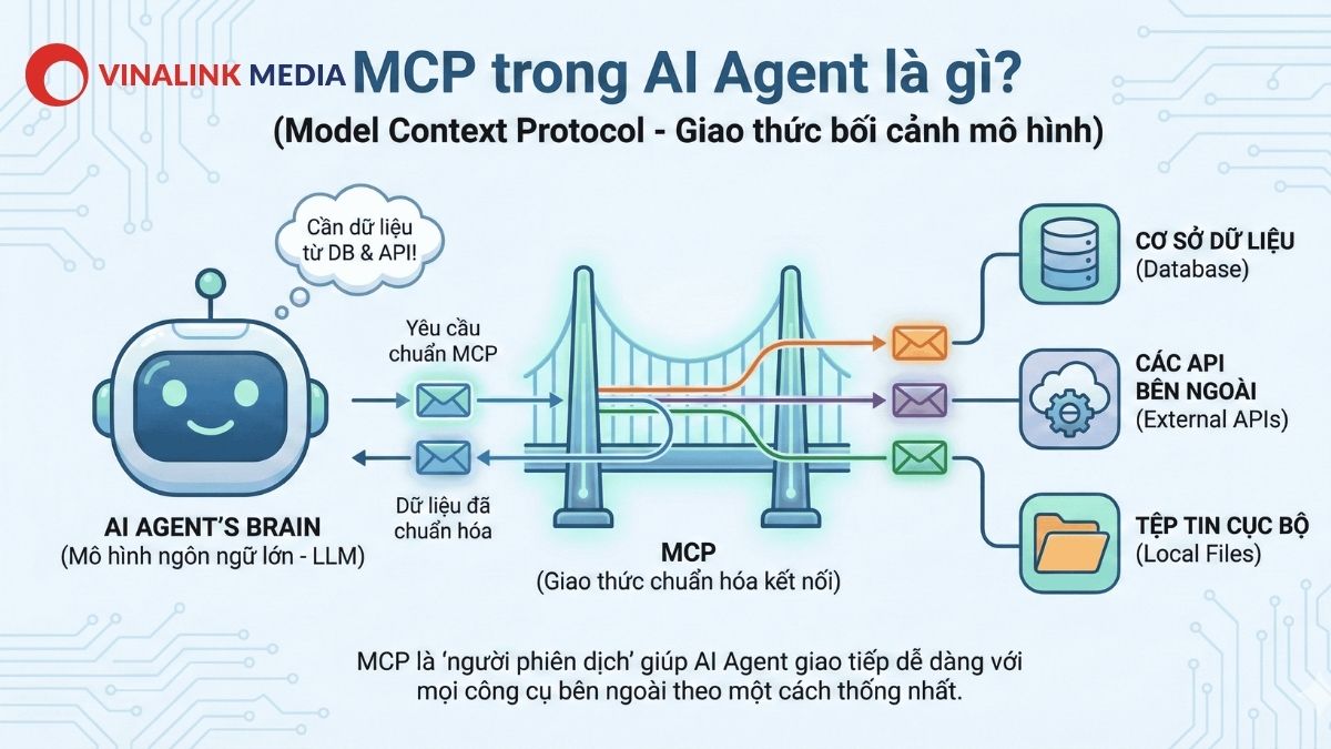 Model Context Protocol (MCP) là kiến trúc nền tảng giúp AI agent duy trì ngữ cảnh, hiểu mục tiêu và thích ứng linh hoạt qua các lớp giao thức phối hợp và bộ nhớ có cấu trúc.