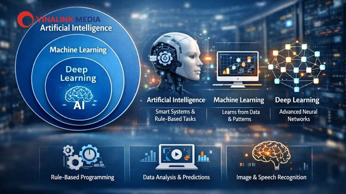 AI là “ô lớn”, Machine Learning là một phần của AI, còn Deep Learning chỉ là một nhánh hẹp bên trong ML - không phải 3 thứ ngang hàng như nhiều người vẫn nghĩ khi đọc các bài so sánh ai và machine learning.