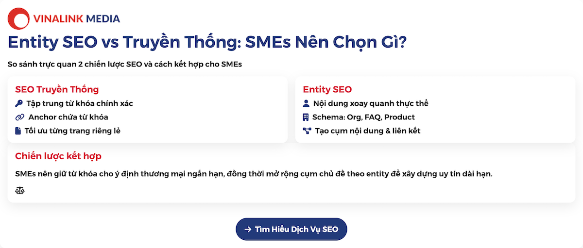 Ứng dụng lý tưởng cho SMEs | Phù hợp với truy vấn thương mại ngắn hạn hoặc ngành cạnh tranh từ khóa cao. | Tốt cho chiến lược dài hạn, giúp thương hiệu bền vững qua entity và tính liên quan chủ đề. | SMEs nên kết hợp cả hai để cân bằng giữa lưu lượng ngắn hạn (từ khóa) và uy tín dài hạn (thực thể, schema, content depth). |