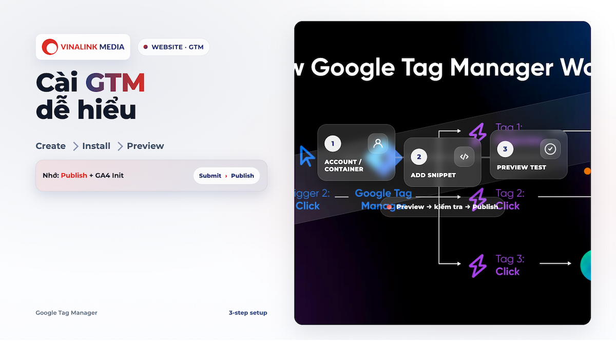 Hiểu rõ cấu trúc Tag – Trigger – Variable là bước đầu tiên để sử dụng Google Tag Manager hiệu quả cho người mới bắt đầu. Mỗi phần tử đóng vai trò riêng biệt nhưng phối hợp chặt chẽ: Tag là đoạn mã thực thi, Trigger quyết định khi nào mã đó chạy, và Variable cung cấp dữ liệu cho các điều kiện hoặc tag.