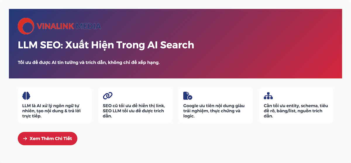 Khác với SEO truyền thống chỉ tối ưu để hiển thị liên kết, SEO thời LLM đòi hỏi bạn phải tối ưu để được trích dẫn nghĩa là nội dung cần rõ ràng, có cấu trúc, giàu thực tế và có thể xác minh.