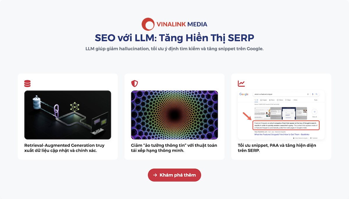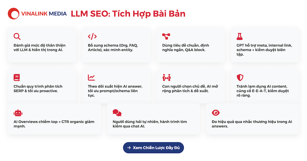 SEO không còn là cuộc chơi của từ khóa, mà là nghệ thuật đáp ứng đúng ý định tìm kiếm. Với chiến lược tích hợp LLM, doanh nghiệp có thể vươn xa hơn dù nguồn lực hạn chế hay hệ thống phức tạp. Đã đến lúc bạn biến nội dung thành đòn bẩy thực sự cho tăng trưởng. Khám phá thêm các mô hình áp dụng thành công cùng Vinalink tại vinalink.com để xây dựng lợi thế bền vững từ hôm nay.