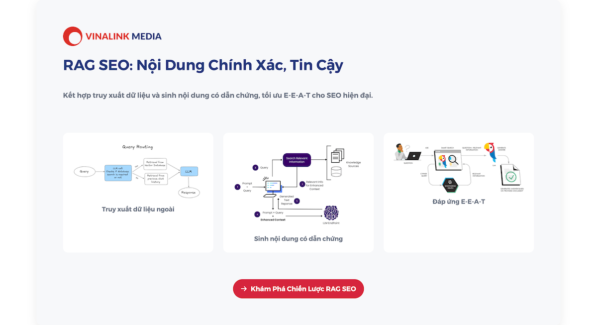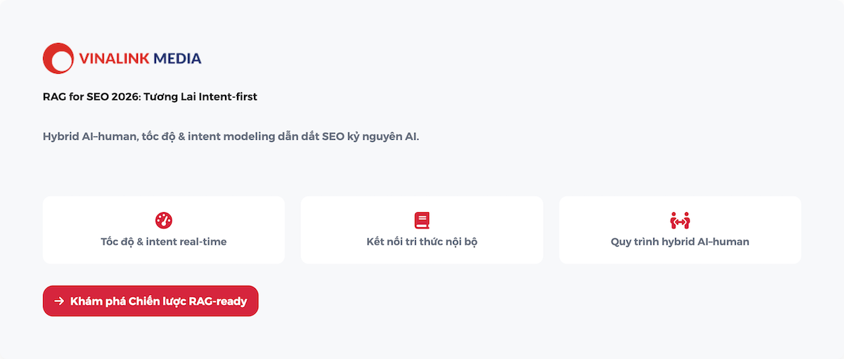 Chiến lược nội dung thành công không chỉ dừng lại ở việc “viết cho Google”, mà là kết nối đúng người, đúng lúc, với đúng thông điệp. Với RAG for SEO, bạn có cơ hội xây dựng hệ thống nội dung thích nghi theo thời gian, thông minh và dễ mở rộng. Đừng để chiến lược số của bạn tụt lại phía sau hãy để Vinalink đồng hành cùng bạn trên hành trình này. Truy cập vinalink.com để khám phá những cách ứng dụng thực tiễn cho tăng trưởng bền vững.