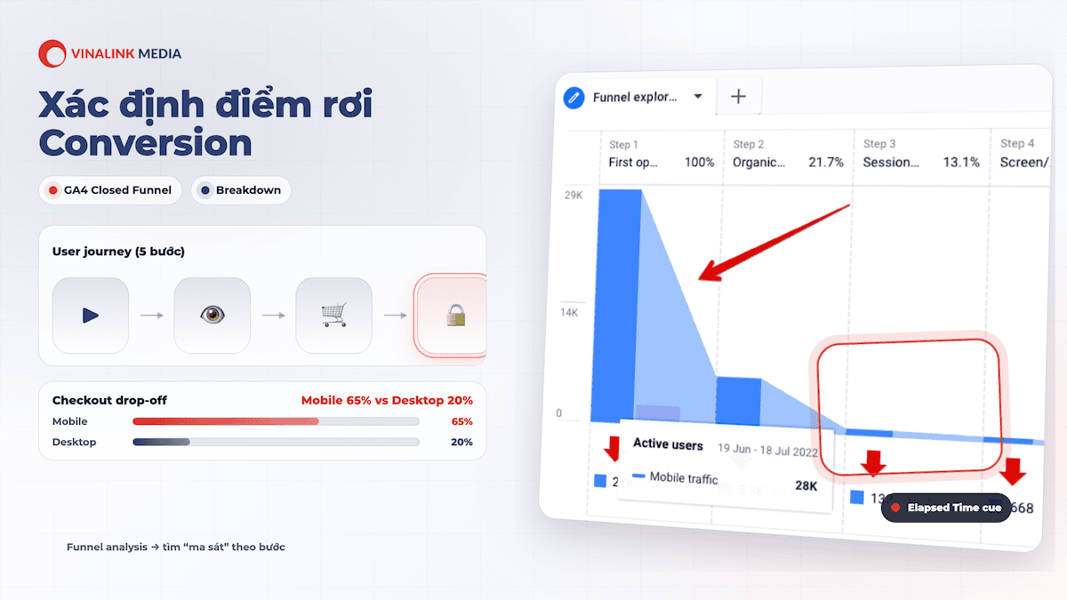 Để triển khai hiệu quả, hãy sử dụng Funnel Exploration ở chế độ “Closed Funnel” và cấu hình theo trình tự: session_start → view_item → add_to_cart → begin_checkout → purchase. Kích hoạt Elapsed Time để phát hiện độ trễ giữa các bước—gợi ý các điểm ma sát tiềm năng.