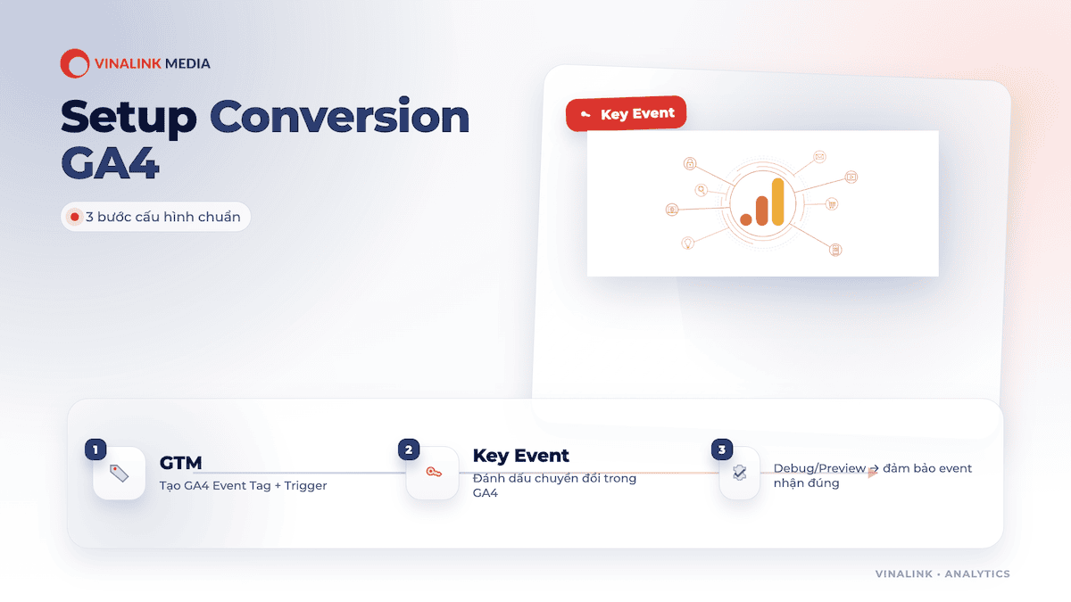 Để thiết lập và theo dõi conversion rate in Google Analytics 4, bạn cần cấu hình sự kiện Key Event trong ba giai đoạn: tạo Tag trong GTM, đăng ký sự kiện trong GA4 và xác minh dữ liệu qua DebugView.