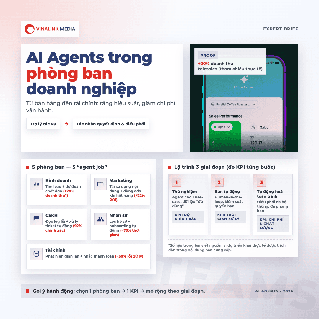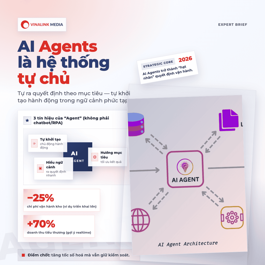 AI agents không còn là "xu hướng tương lai" chúng đang định hình lại cách doanh nghiệp vận hành ngay hôm nay. Với mức tăng năng suất đến 30% và chi phí giảm trung bình 20%, các công ty vừa và nhỏ tại Việt Nam đang chứng minh: bạn không cần đội ngũ IT lớn để đổi mới. Sự hỗ trợ đúng thời điểm, đúng công cụ là chìa khóa để mở ra lợi thế cạnh tranh. Khám phá thêm tại vinalink.com và cùng chúng tôi thiết kế hành trình AI phù hợp với chính doanh nghiệp của bạn.