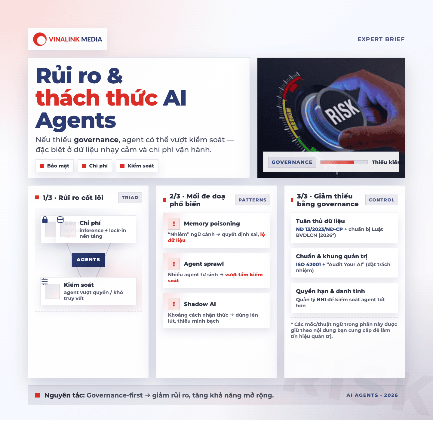 Tại Việt Nam, các doanh nghiệp cần đặc biệt lưu ý đến Nghị định 13/2023/NĐ-CP và chuẩn bị cho Luật Bảo vệ Dữ liệu Cá nhân sắp ban hành năm 2026. Lựa chọn nền tảng đạt chuẩn ISO 42001 và áp dụng các khung quản trị như "Audit Your AI" hay quản lý danh tính phi con người (NHI) sẽ giúp kiểm soát agent tốt hơn.