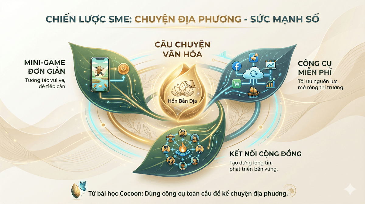 Các doanh nghiệp SME Việt Nam có thể áp dụng chiến lược từ chiến dịch “Khám phá Việt Nam của Cocoon” bằng cách kể câu chuyện thương hiệu gắn với địa phương, sử dụng nội dung trò chơi đơn giản trên mạng xã hội và tận dụng công cụ miễn phí để tăng cường kết nối cộng đồng.