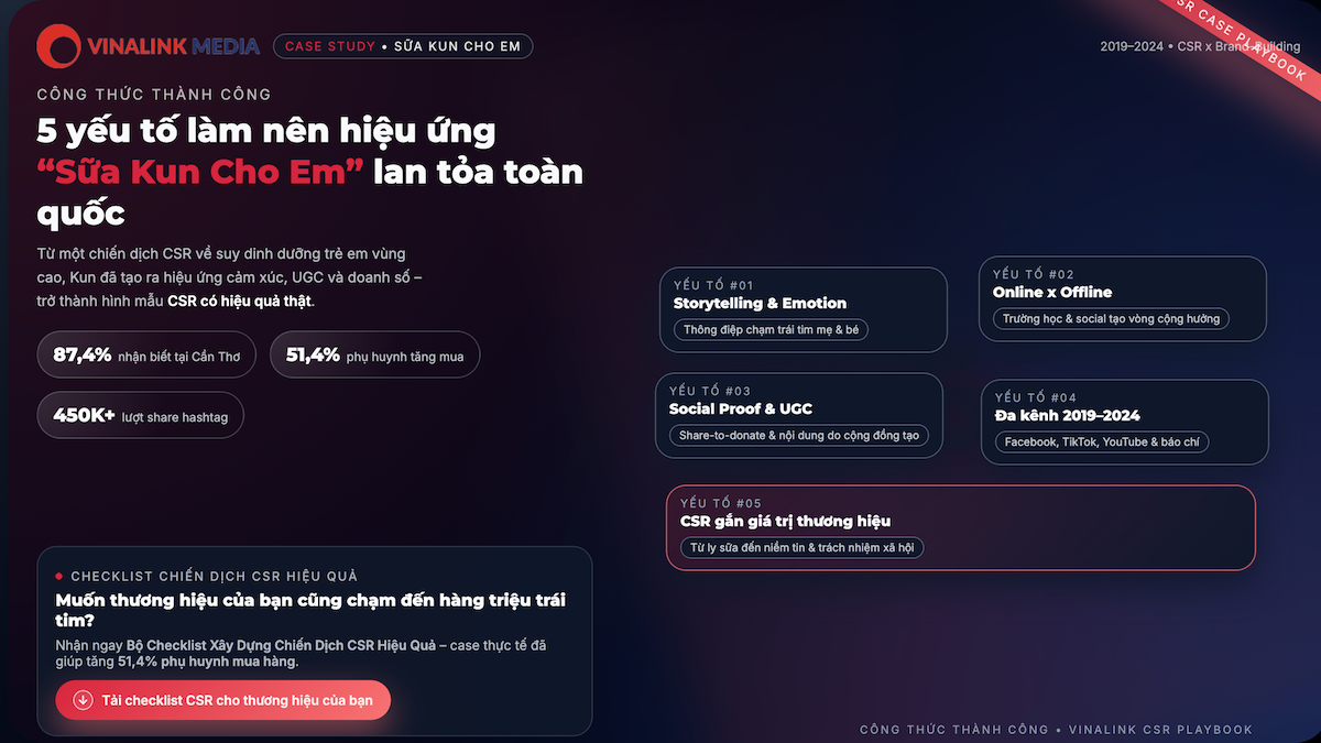 “Sữa Kun Cho Em” không chỉ là một case study CSR thành công - nó là bản thiết kế sống động cho truyền thông cảm xúc tạo tác động thật. Với sự cộng hưởng từ cộng đồng, influencer, và cam kết rõ ràng về hành động, chiến dịch này giúp thương hiệu chạm đến trái tim lẫn lý trí. Nếu bạn đang tìm một mô hình vừa truyền cảm hứng, vừa đo lường được ROI, đây chính là một khung tham chiếu đáng giá. Trải nghiệm thêm các case tương tự tại vinalink.com để chuẩn bị cho chiến dịch của riêng bạn.