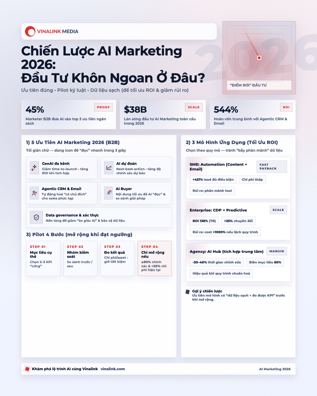 Không phải công cụ AI nào cũng là “cứu tinh” – nhưng chiến lược đúng sẽ biến chúng thành lợi thế cạnh tranh vững chắc. Từ tự động hóa ABM đến phân tích dự đoán, AI Marketing 2026 đang mở ra cơ hội tăng ROI, tiết kiệm chi phí, và nâng cấp trải nghiệm khách hàng một cách rõ rệt. Với bối cảnh biến động, hành động thông minh hôm nay chính là nền tảng bền vững cho ngày mai. Khám phá thêm chiến lược phù hợp cùng Vinalink tại https://vinalink.com – nơi doanh nghiệp bắt đầu hành trình AI một cách bài bản và an toàn.