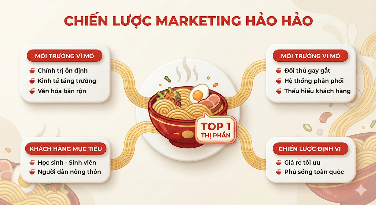 Bên cạnh các yếu tố vĩ mô đã đề cập ở trên, để xây dựng kế hoạch marketing hiệu quả cho mì Hảo Hảo, Acecook đã dành nguồn lực tập trung vào việc nghiên cứu và đánh giá các yếu tố môi trường vi mô gồm ba phần chính: đối thủ cạnh tranh, nhà phân phối và khách hàng.