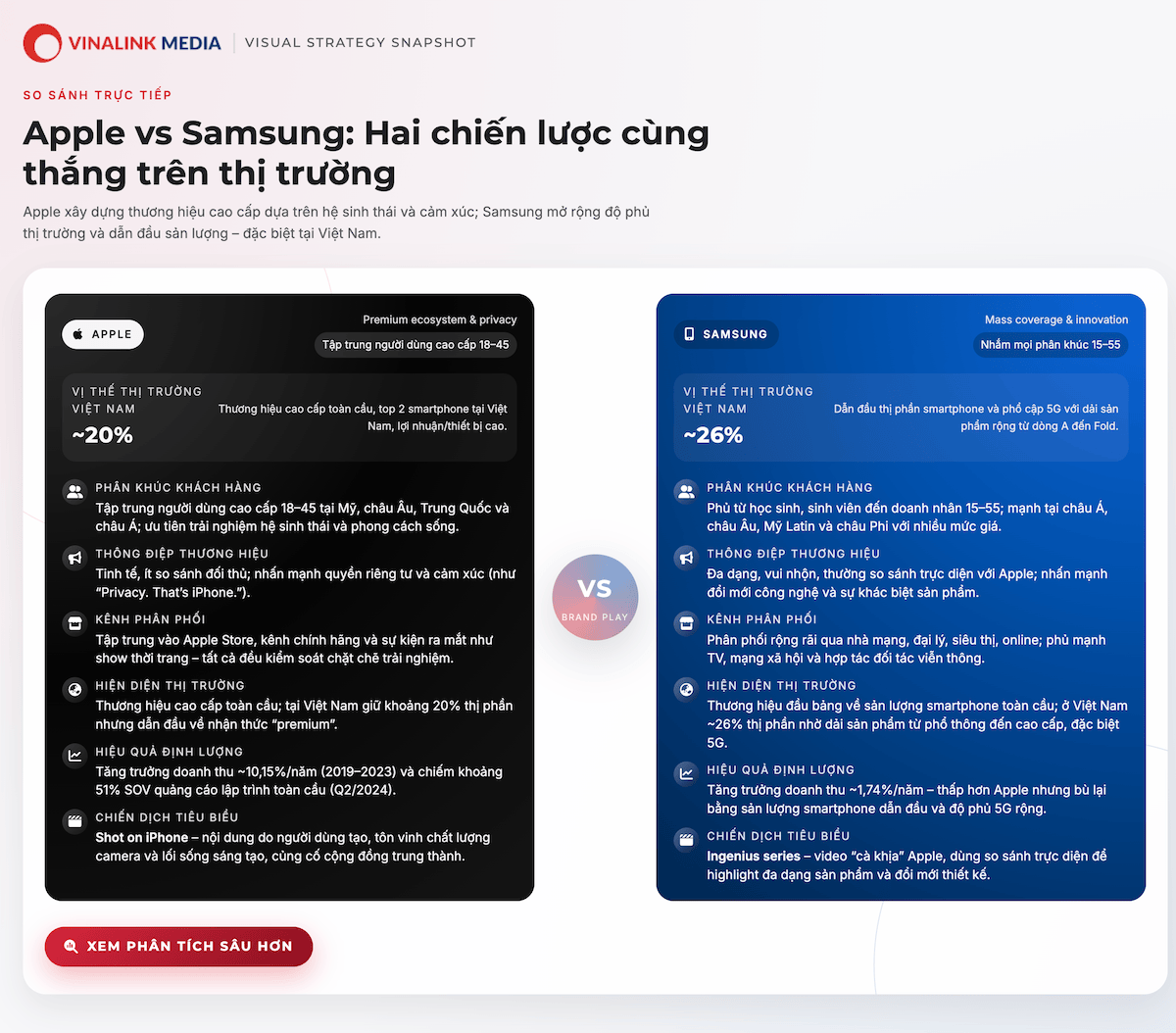Apple dẫn đầu về lòng trung thành thương hiệu, trải nghiệm người dùng đồng bộ và chiến lược kể chuyện giàu cảm xúc, đặc biệt hấp dẫn trong các thị trường cao cấp. Trong khi đó, Samsung thống trị thị phần toàn cầu nhờ sự linh hoạt trong sản phẩm, giá cả, và cách tiếp cận marketing trực tiếp – rất phù hợp với người tiêu dùng chú trọng hiệu năng và giá trị thực tế.