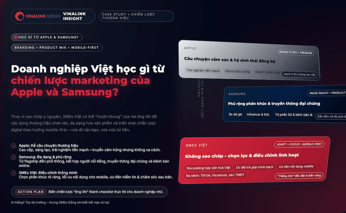 Bài học cho SMEs Việt Nam: Hãy kết hợp điểm mạnh của cả hai ông lớn. Dùng chiến lược đa kênh để tăng độ phủ thương hiệu. Kể câu chuyện tạo kết nối như Apple, đồng thời chứng minh tính năng thực tế như Samsung. Định vị rõ từng phân khúc giá và đầu tư vào trải nghiệm khách hàng liền mạch để xây dựng lòng trung thành bền vững.