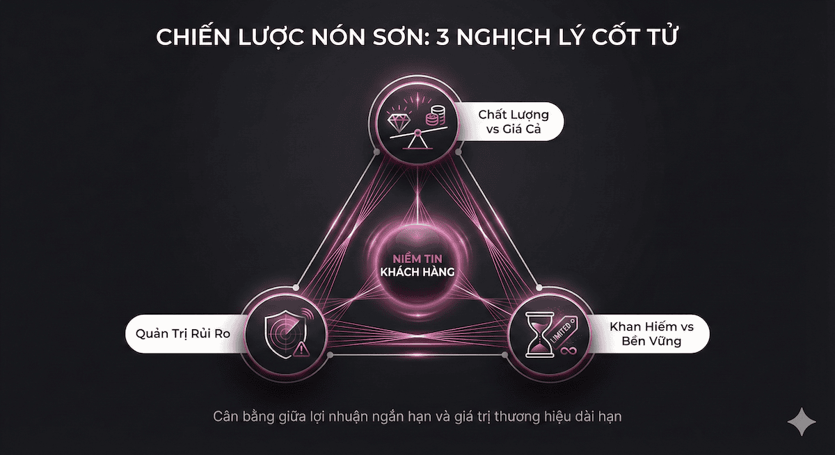 Nền tảng chiến lược marketing của Nón Sơn nằm ở sự kết hợp giữa giá trị cảm xúc và giá trị chức năng, tạo nên hình ảnh thương hiệu xa xỉ giữa thị trường đại chúng.