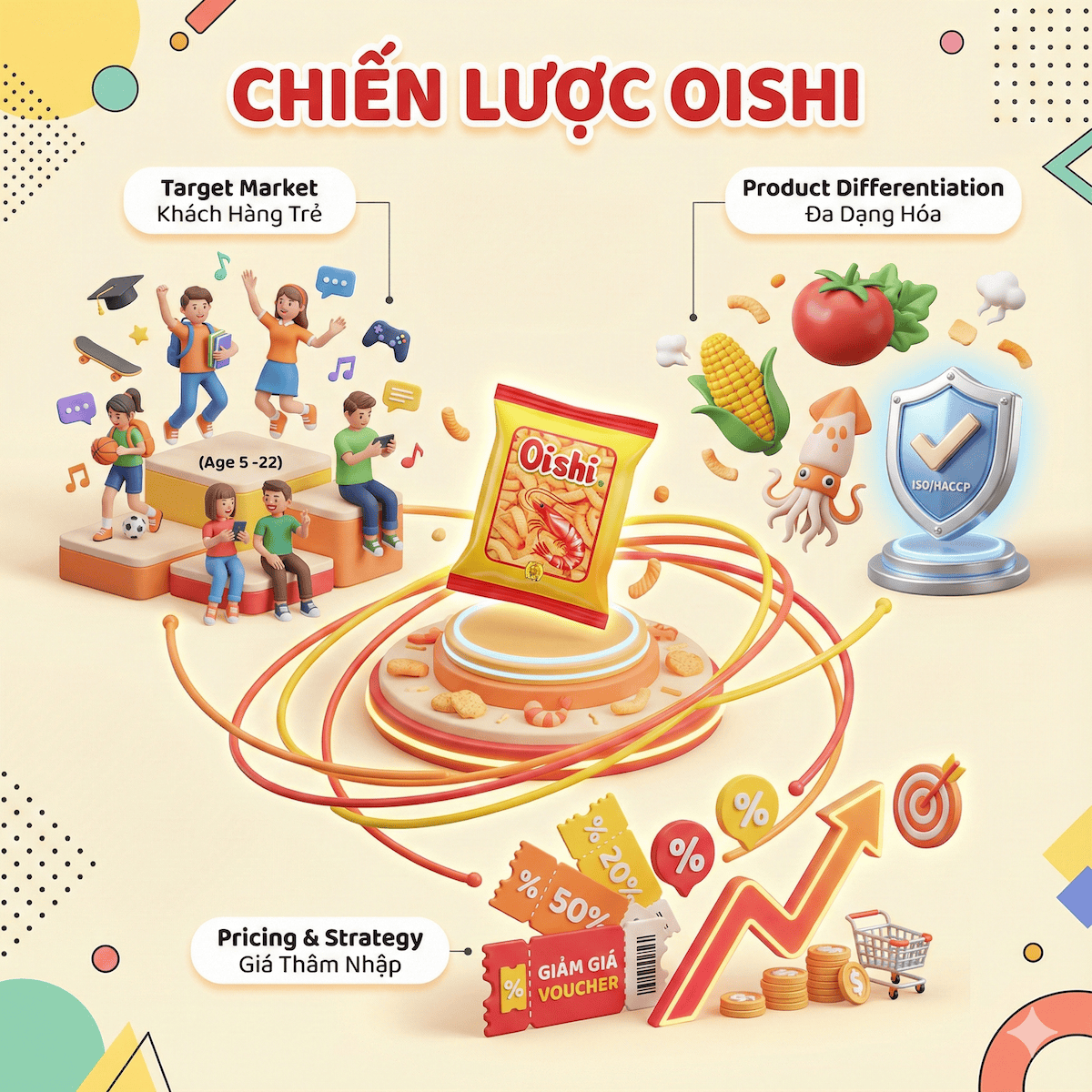 Hiểu được điều này, Oishi phát triển các sản phẩm snack đa dạng với các vị hấp dẫn với giá rẻ để thu hút sự chú ý của nhóm đối tượng này. Đồng thời, chiến lược tiếp thị của doanh nghiệp thường đánh mạnh việc tạo ra những trải nghiệm thú vị, kích thích sự tò mò và khám phá của khách hàng.