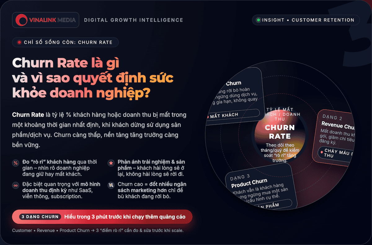 Hiểu và kiểm soát Churn Rate không chỉ giúp bạn giữ chân khách hàng, mà còn tối ưu từng đồng ngân sách đã bỏ ra cho quảng cáo và chăm sóc. Từ các công cụ như CRM, phân tích dữ liệu, đến dự báo bằng AI — bạn hoàn toàn có thể hành động sớm để ngăn “chảy máu” khách hàng. Hãy để Vinalink đồng hành cùng bạn trên hành trình xây dựng chiến lược giữ chân khách hàng vững chắc hơn. Truy cập vinalink.com để nhận hướng dẫn phù hợp cho doanh nghiệp của bạn.