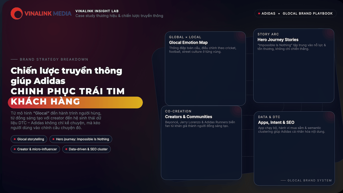 Chiến lược truyền thông giúp Adidas chinh phục trái tim khách hàng bắt đầu từ việc kết hợp khéo léo giữa cảm xúc toàn cầu và cá nhân hóa địa phương thông qua mô hình “Glocal”.