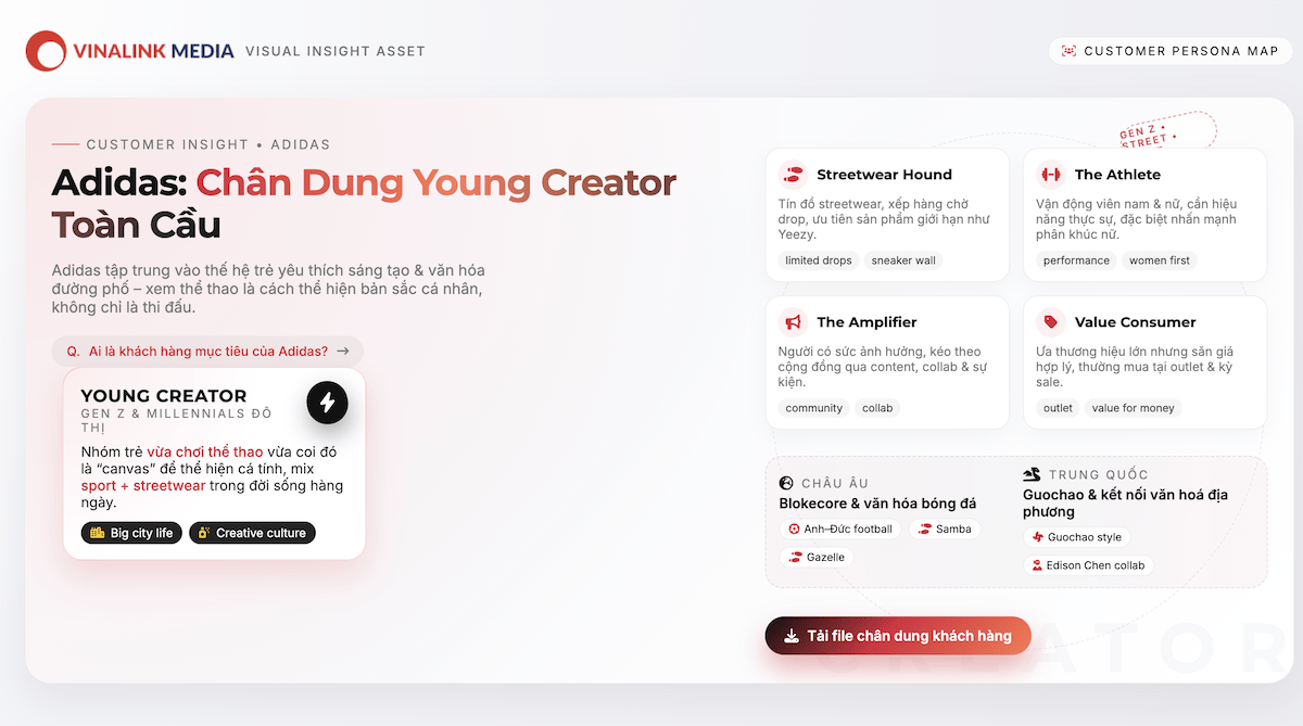 Adidas không chỉ bán giày – họ xây dựng cộng đồng và phản chiếu lối sống của khách hàng mục tiêu. Bằng cách hiểu sâu thói quen, giá trị và hành vi tiêu dùng, họ biến dữ liệu thành chiến lược cảm xúc. Nếu doanh nghiệp của bạn cũng đang tìm cách định vị và kết nối như thế, Vinalink sẵn sàng đồng hành từ chiến lược đến triển khai thực tế. Khám phá thêm tại vinalink.com để bắt đầu hành trình xây dựng thương hiệu có linh hồn.