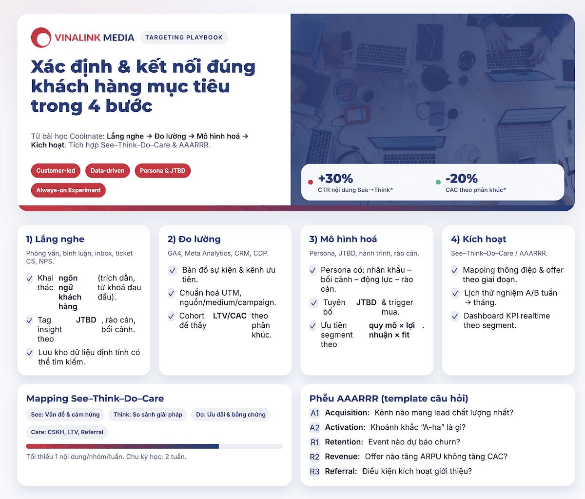 Cuối cùng, hãy kích hoạt các nội dung phù hợp theo từng giai đoạn See–Think–Do–Care hoặc phễu AAARRR, thử nghiệm liên tục và cập nhật theo dữ liệu mới nhất.