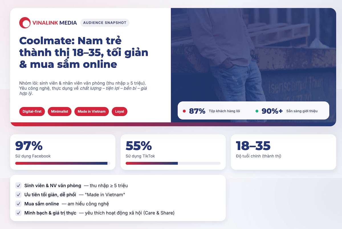 Khách hàng mục tiêu của Coolmate là nam giới trẻ sống tại thành thị, độ tuổi 18–35, yêu thích sự tối giản, tiện lợi và mua sắm online. Nhóm này chủ yếu là sinh viên và nhân viên văn phòng có thu nhập từ 5 triệu đồng trở lên, chiếm đến 87% tệp khách hàng. Họ am hiểu công nghệ, thường xuyên sử dụng mạng xã hội như Facebook (97%) và TikTok (55%), đồng thời quan tâm đến giá trị thực tế: chất lượng, tiện lợi, bền bỉ và giá hợp lý.