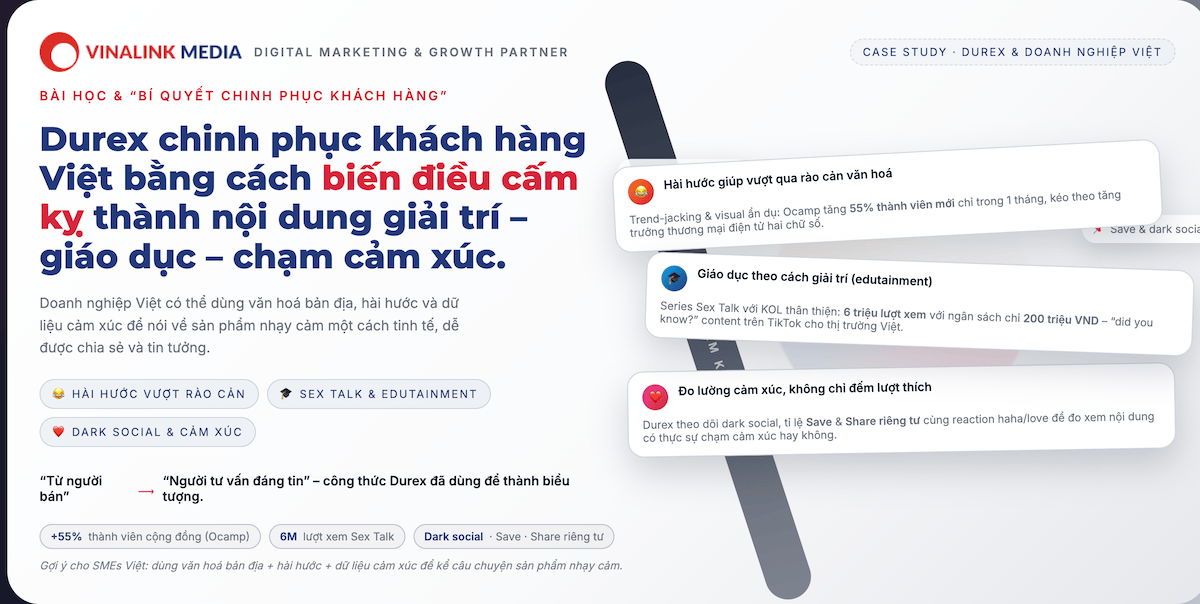 Durex chinh phục khách hàng Việt nhờ biến điều cấm kỵ thành nội dung giải trí, kết hợp giữa hài hước, giáo dục và dữ liệu cảm xúc. Doanh nghiệp Việt có thể học cách dùng văn hoá bản địa để tạo niềm tin và phá vỡ rào cản tâm lý tương tự.