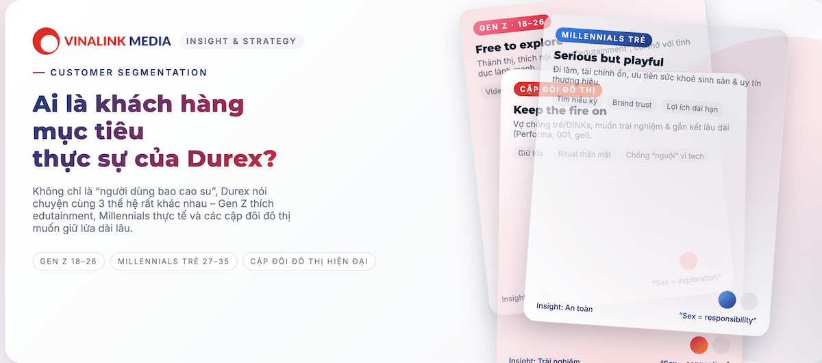 Khách hàng mục tiêu thực sự của Durex gồm ba nhóm chính: Gen Z, Millennials trẻ và các cặp đôi đô thị hiện đại. Mỗi nhóm có nhu cầu, tâm lý và hành vi tiêu dùng hoàn toàn khác biệt – chính sự khác biệt này là chìa khóa cho các chiến dịch truyền thông thành công.