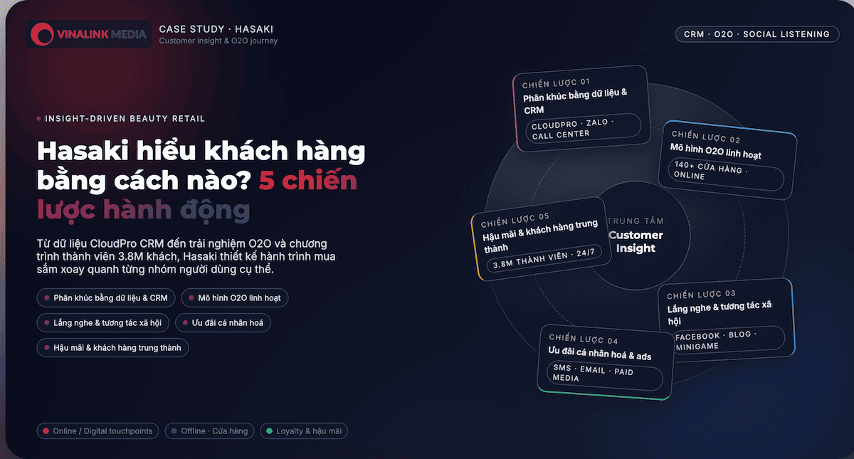 Hasaki triển khai hệ thống CloudPro CRM để thu thập, phân tích và phân loại khách hàng theo độ tuổi, hành vi mua sắm và kênh tương tác. Dữ liệu này được sử dụng để cá nhân hóa trải nghiệm marketing qua nhiều nền tảng như Zalo, call center và Facebook Messenger.