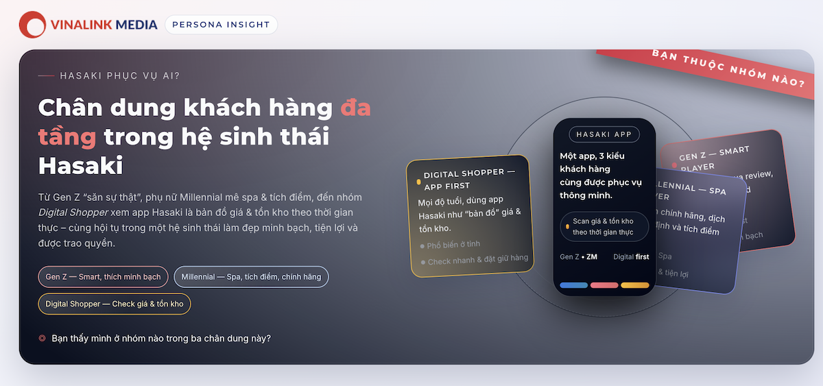 Hasaki không đơn thuần “bán đúng sản phẩm” – mà đang từng ngày xây dựng mối quan hệ bền chặt với đúng người. Từ Gen Z theo trend, các chị em bận rộn cần spa uy tín, đến khách online nhạy cảm với giá – mỗi nhóm đều thấy mình được thấu hiểu. Đó là lý do Hasaki không chỉ tăng trưởng, mà còn được yêu mến. Trải nghiệm cách Vinalink giúp thương hiệu của bạn định vị đúng tệp khách hàng mục tiêu tại https://vinalink.com.