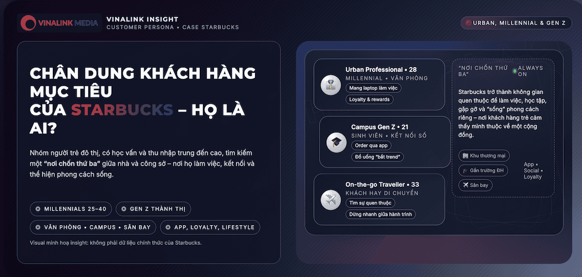 Chân dung khách hàng mục tiêu của Starbucks là nhóm người trẻ đô thị, có học vấn và thu nhập trung đến cao, chủ yếu trong độ tuổi từ 25 đến 40. Họ là những người yêu thích trải nghiệm, đề cao sự tiện lợi và lựa chọn thương hiệu dựa trên giá trị cộng đồng, kết nối và tính bền vững.