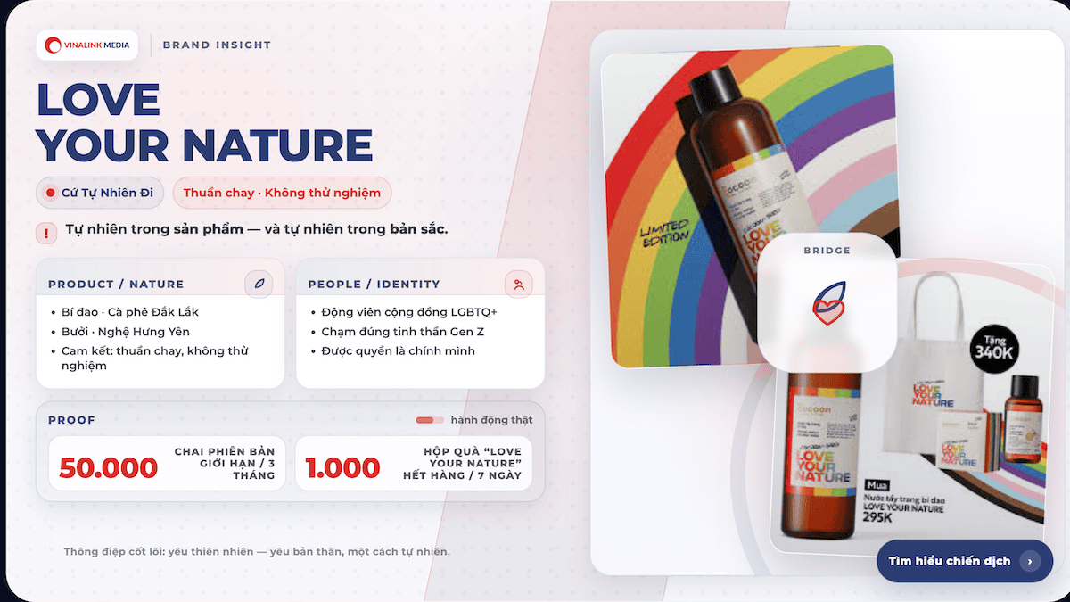 Chiến dịch này không chỉ thể hiện rõ giá trị cốt lõi của Cocoon, mà còn biến câu chuyện thương hiệu thành trải nghiệm cảm xúc. Kết hợp cùng rapper Suboi và các biểu tượng văn hóa đa dạng, thông điệp đã chạm đến hàng triệu người và được chuyển hóa thành hành động rõ ràng: 50.000 chai phiên bản giới hạn được bán trong 3 tháng, và 1.000 hộp quà “Love Your Nature” hết hàng sau 7 ngày.