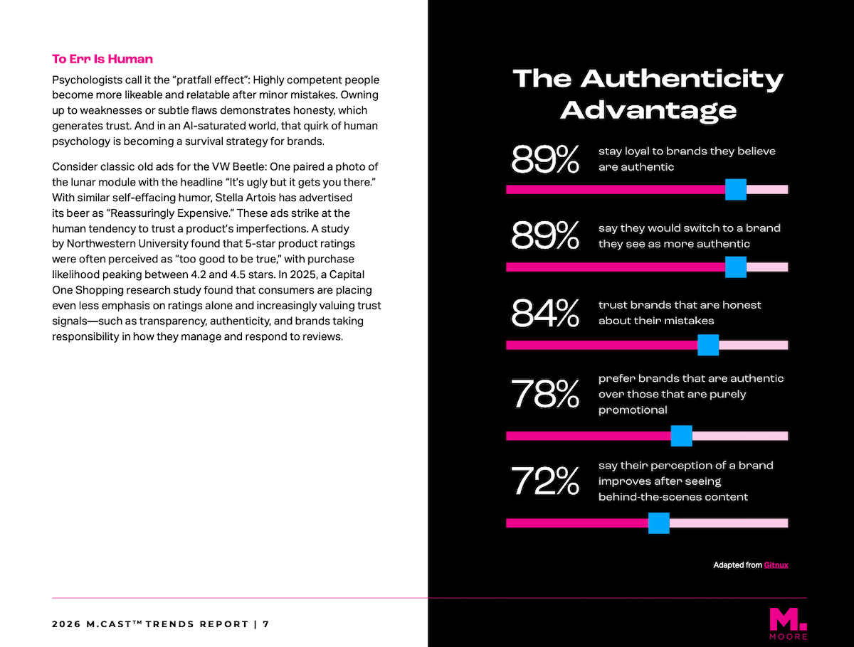 Thay vì né tránh lỗi nhỏ, các thương hiệu thông minh đang dùng chúng như dấu hiệu cho thấy “tôi là con người thật”. Hiệu ứng “Pratfall” cho thấy người có năng lực nhưng vẫn vấp ngã nhẹ lại dễ gây thiện cảm hơn. Gen Z và Millennials – những thế hệ đề cao tính xác thực – phản hồi mạnh mẽ hơn với nội dung “thô”, có chiều sâu cảm xúc và dấu vết con người.
