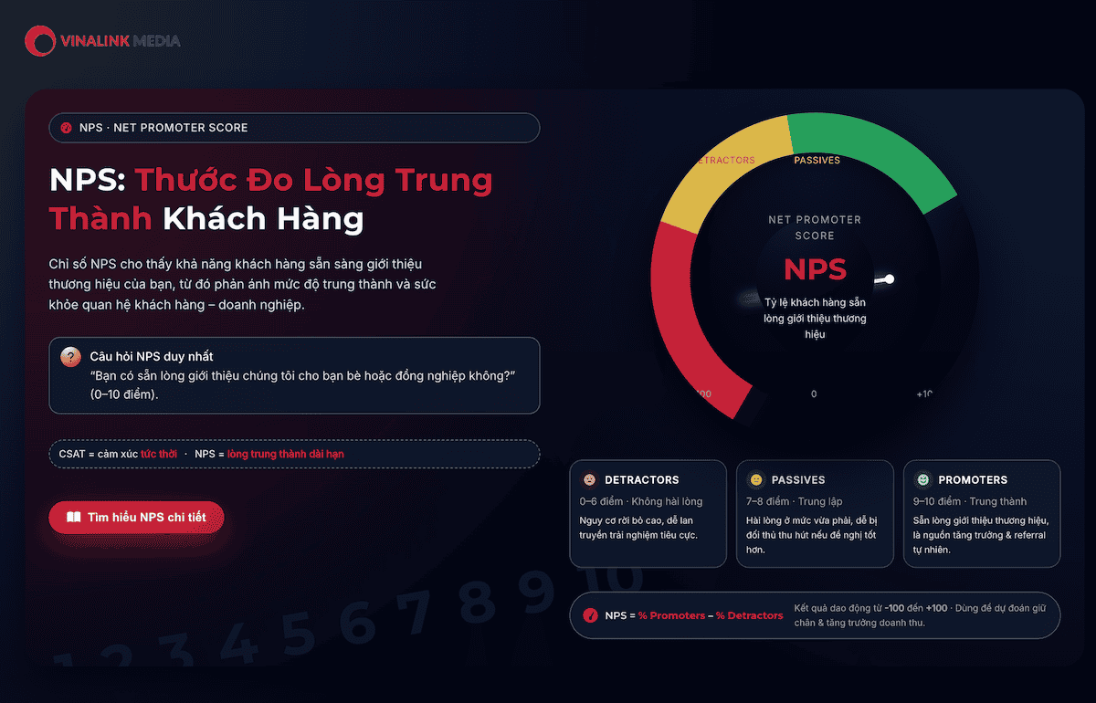 Khác với CSAT chỉ phản ánh cảm xúc tức thời, NPS thể hiện lòng tin dài hạn, là “phong vũ biểu” của mối quan hệ khách hàng–doanh nghiệp. Tại Việt Nam, nhiều doanh nghiệp đã ứng dụng NPS để cải thiện trải nghiệm, tăng tỷ lệ giữ chân, và dự đoán tăng trưởng doanh thu.