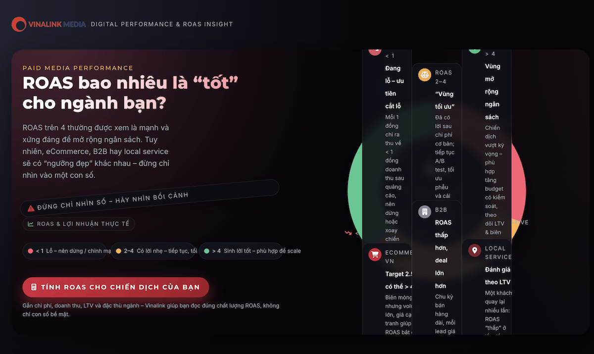 Tuy nhiên, mức ROAS lý tưởng không giống nhau giữa các ngành. Ví dụ, eCommerce tại Việt Nam thường nhắm ROAS 2.5–3, nhưng có thể vượt 4 nhờ giá cạnh tranh và khối lượng lớn. Ngược lại, ngành B2B có ROAS thấp hơn do chu kỳ bán hàng dài, và local service thì đánh giá ROAS theo giá trị vòng đời khách hàng.