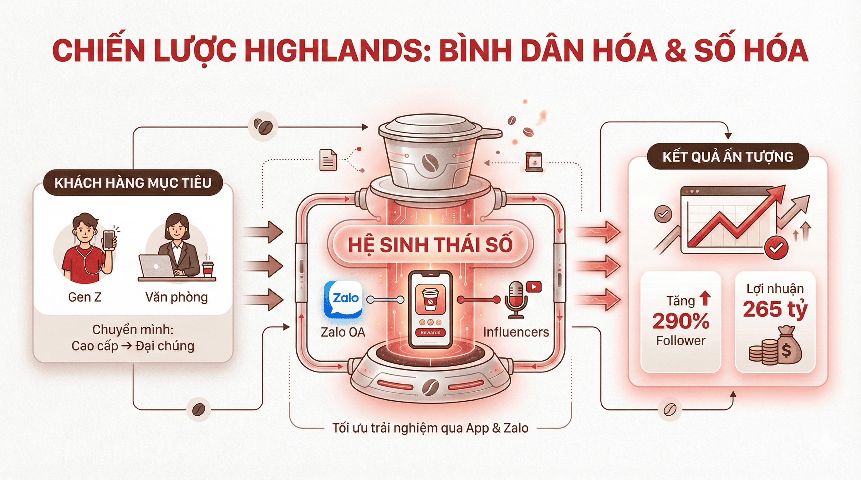 Thành công của Highlands thể hiện rõ qua các con số: tăng 290% lượng theo dõi Zalo OA, hơn 2 triệu lượt tương tác app trong 40 ngày, giữ vững lòng trung thành dù giá tăng 10–15%, và đạt lợi nhuận 265 tỷ sau dịch.