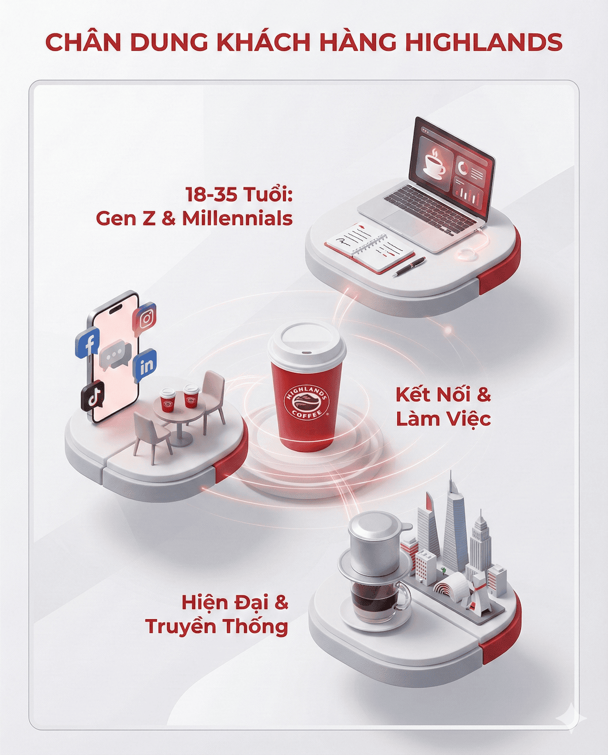 Chân dung khách hàng mục tiêu Highlands Coffee tập trung vào nhóm tuổi từ 18–35, gồm Gen Z và Millennials tại các thành phố lớn như Hà Nội, TP.HCM, Đà Nẵng. Đây là những người trẻ có thu nhập trung bình, thích trải nghiệm không gian hiện đại, giá cả hợp lý và giá trị văn hóa Việt.